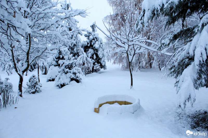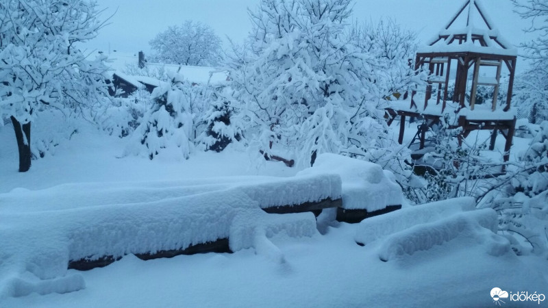 Csütörtök, 10:00 - Roskadoznak a fák a hó súlya alatt Drégelypalánkon, 18-20 cm hó hullott.